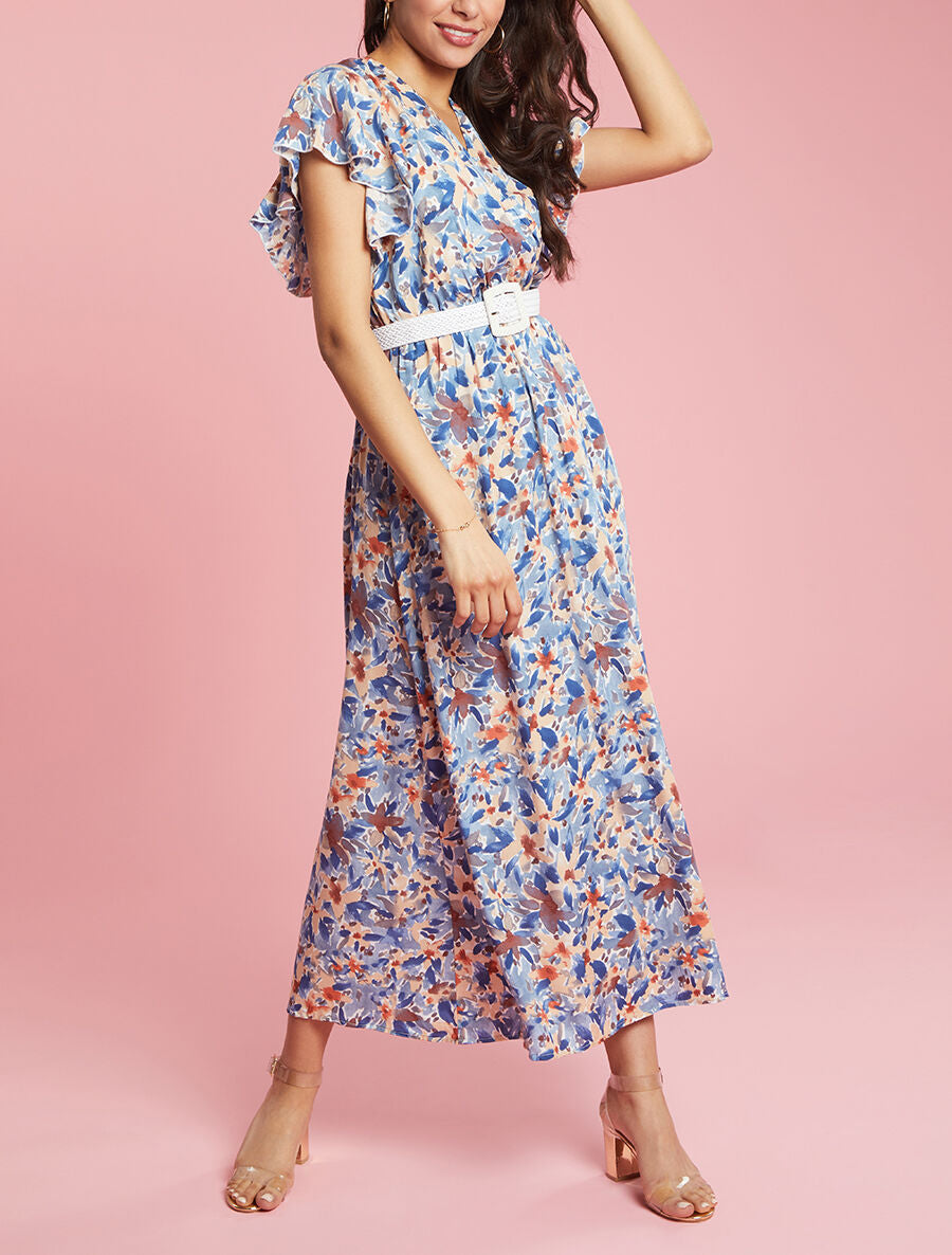 Robe longue empire à manches volantées imprimé aquarelle florale - Bleu/beige - 4